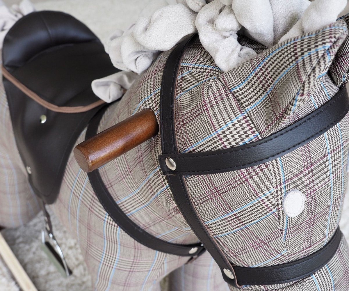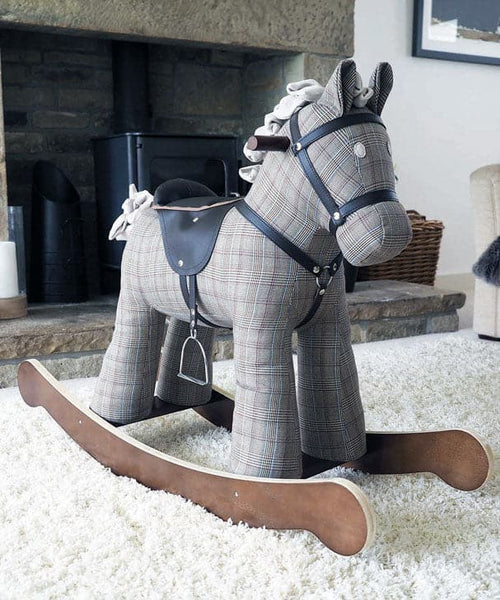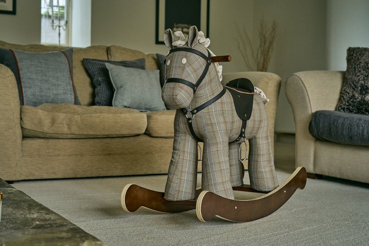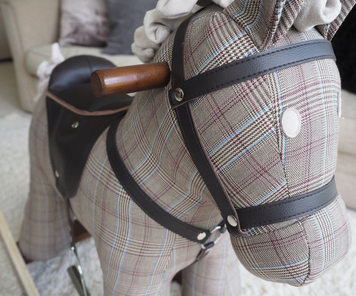Jasper's body is dressed in a textured chocolate and sandy coloured woven check fabric, adding a touch of sophistication to this classic rocking horse. The stylized padded leatherette saddle and matching bridle further enhance its luxurious appeal.