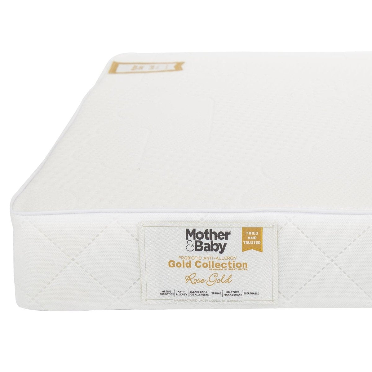 Introducing the Mother & Baby Rose Gold Anti-Allergy Sprung Cot Mattress, available at For Your Little One—the perfect choice for your little one's peaceful slumber.