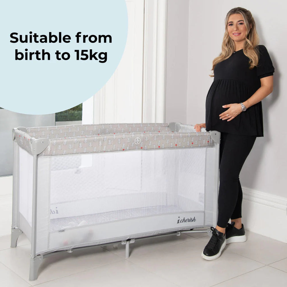 Invest in the My Babiie Dani Dyer Elephants Travel Cot and enjoy the convenience of a versatile travel cot alongside the added touch of elegance that Dani Dyer's "Cherish" collection brings.