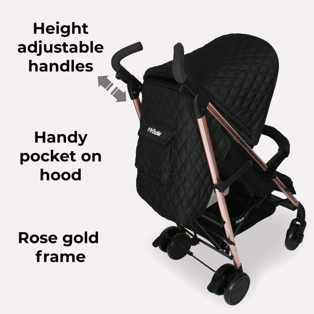 This stylish stroller from My Babiie is a must-have for parents on the go. Designed by the talented mum, Billie Faiers, as part of her "Signature Range", this Quilted Stroller combines style and functionality with its sleek black design and rose gold frame.
