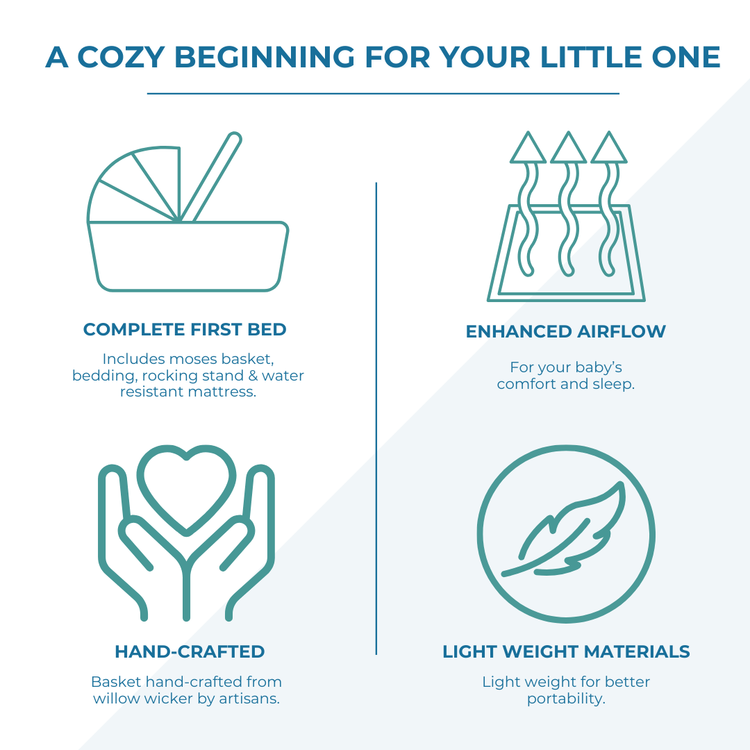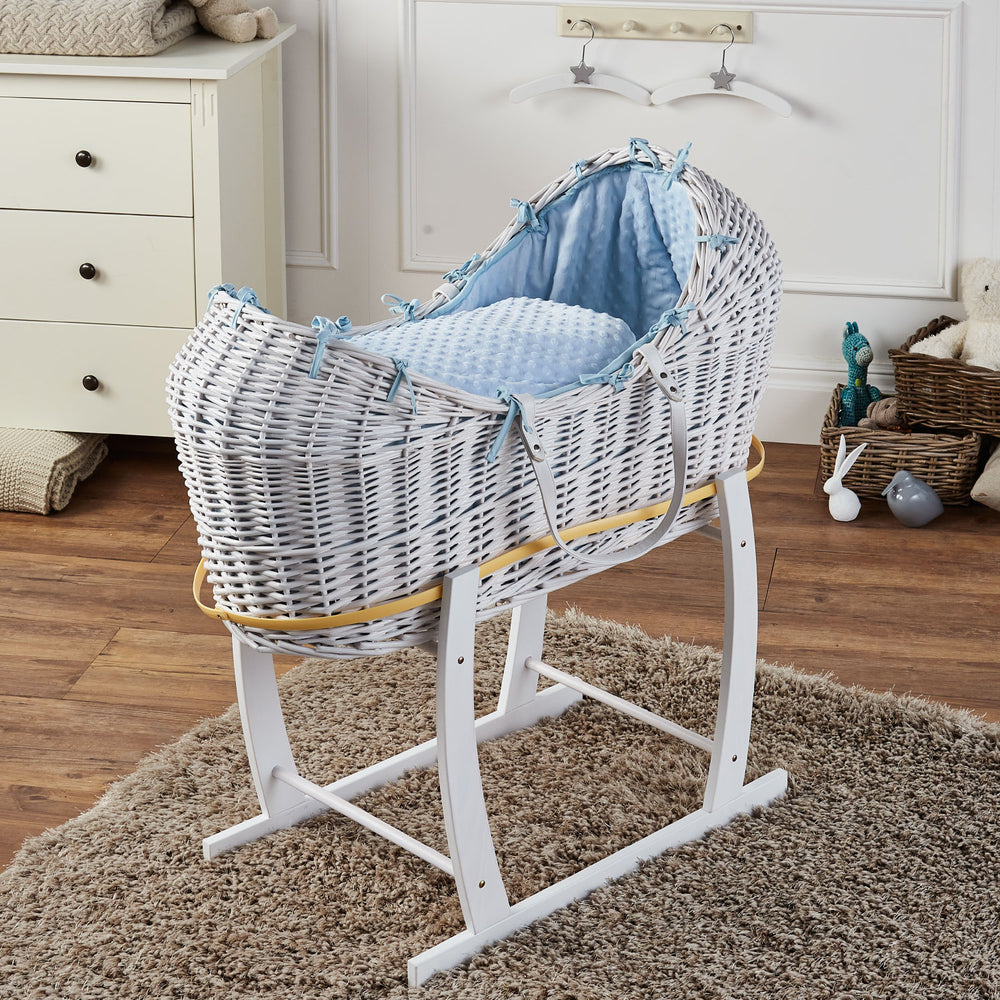 Combining style, comfort and safety, the wicker Moses basket would make a great addition to any nursery. It features waffle Moses dressing that adds to the overall visual appeal. This wicker pod is paired with a firm hypo-allergenic mattress that provides necessary support to the baby’s back while sleeping and space-tec padding that offers extra cushioning. The baby Moses basket includes a cosy quilt that ensures optimum comfort. Suitable for use from birth, the infant Moses basket includes a rocking stand which is sure to help you in soothing your little one. The Moses basket stand also makes it easy to reach the baby and keep an eye on him/her.